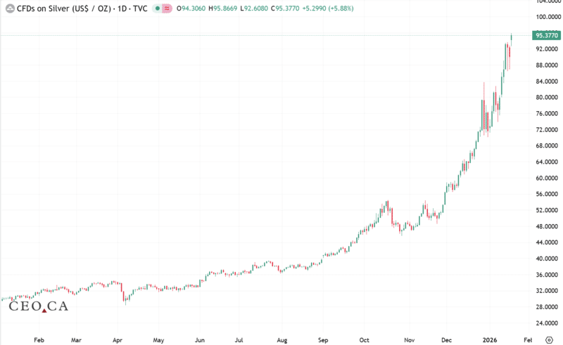 The last time we checked in on the white metal, it had just blown through its mid‑October high of $54.50 with explosive momentum. That was in early December. Fast‑forward only a few short weeks, and we’re sitting at $94 and change—up more than 30% since the calendar flipped to 2026.
