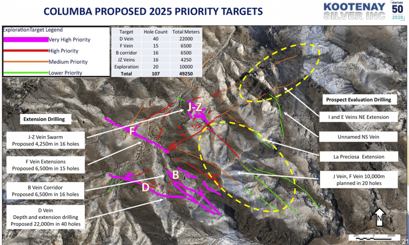 Concerning these recent assay values, Kootenay’s President & CEO, James McDonald: “Drilling continues to deliver positive results at Columba. Holes CDH-25-220, 223 and 225 along with previously announced 216 are hitting good wide mineralized vein and vein stockwork breccia at some of the deepest depths tested thus far on the D Vein leaving this area wide open to depth. Also impressive is the wide-open expansion potential in the Lupe and B 2 veins. This shows well on the long sections. We are now approximately 13,000 meters into our 50,000-meter program with 7 holes awaiting assays and drill holes CDH 25-236 and 237 underway”