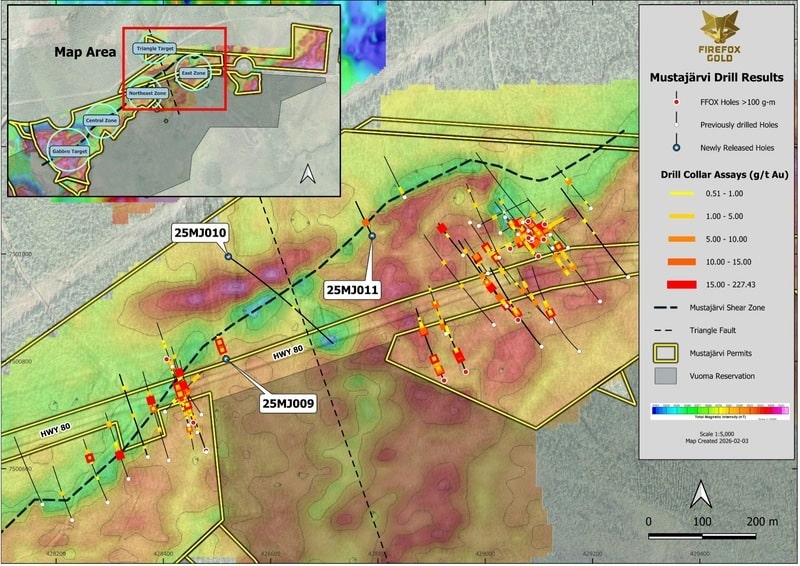 Earlier today (Feb. 9) they reported a solid hit from their 100%-held Mustajärvi Gold Project: FireFox Gold Expands the Northeast Zone, including 54.91 g/t Gold over 1.95 Metres in 95 Metre Step-out at Mustajärvi Gold Project, Finland.